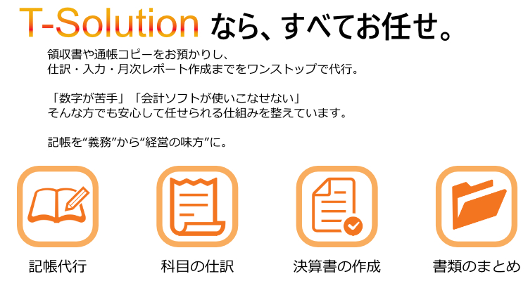 記帳代行のプロがあなたの経理をサポート。 正確・安心・スピーディな経理代行ならT-Solution。