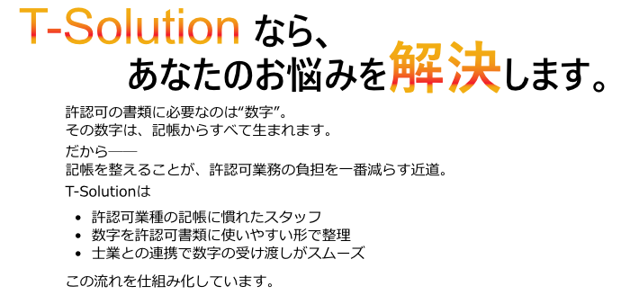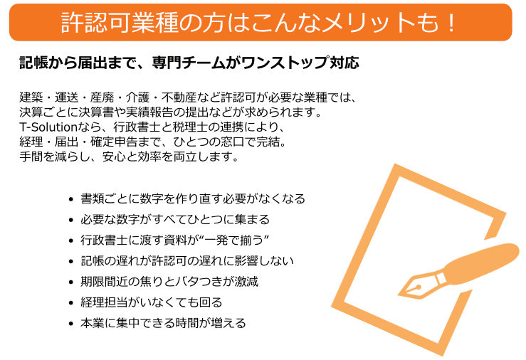 建設業や運送業など、許認可業種では独自の帳簿管理や提出書類が必要になります。T-Solutionでは、業種ごとの特性を理解した記帳サポートを行っています。